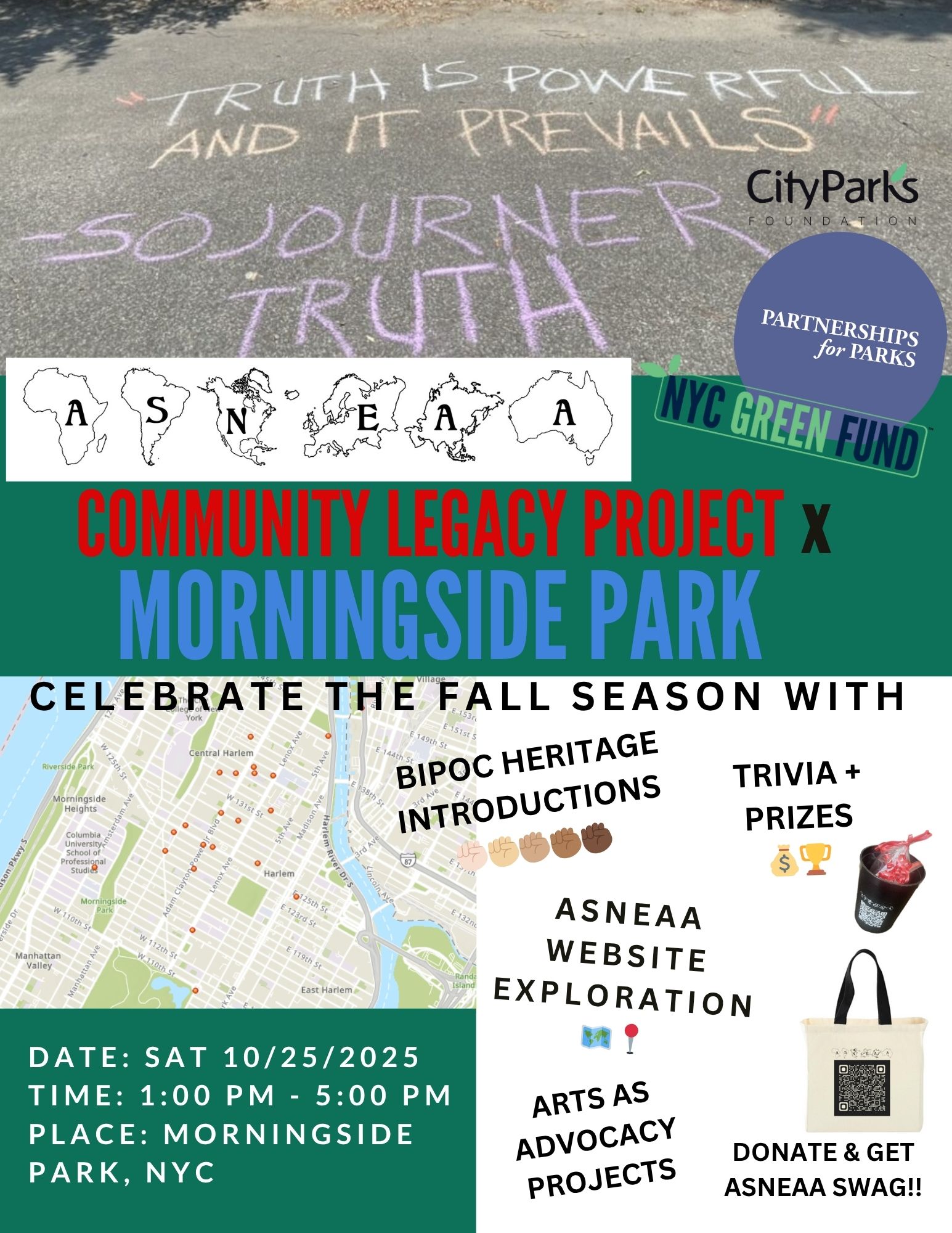 Of course, HARLEM showed ASNEAA mad love!!!! Folks in all walks of life (literally and figuratively), stopped by the retractable banner to learn more about the ASNEAA mission. I know the ancestors of the Harlem Renaissance was proud of my soap boxing! CLP x Morningside Park participants were invited to: